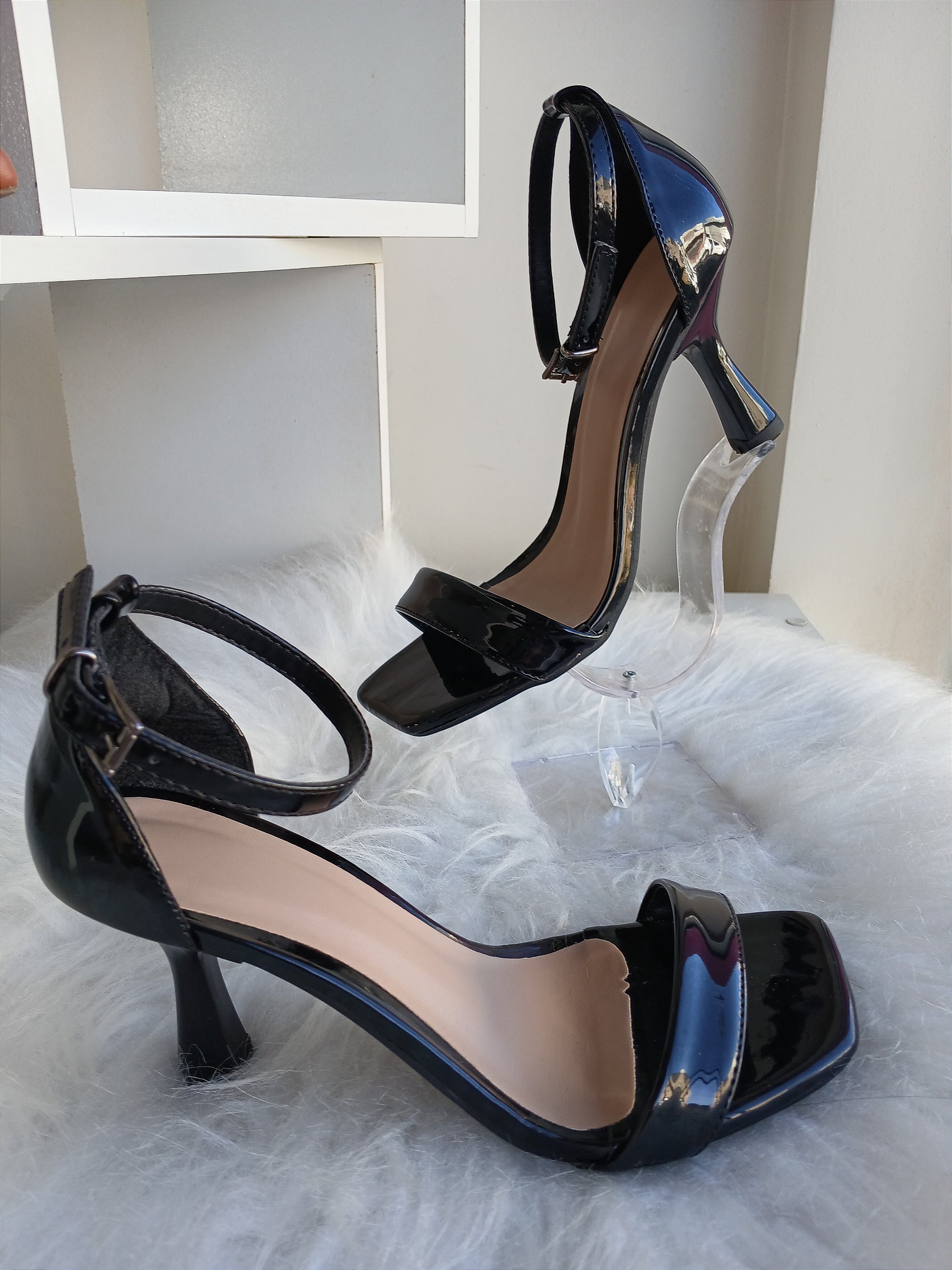 Material napa sintético verniz na cor preta com regulagem de fivela no tornozelo